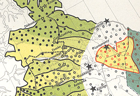 Karta ur boken NORRLAND Natur, befolkning och näringar, utgiven av Geografiska förbundet och Industriens utredningsinstitut, beräknat under åren 1925-1940. Tryckt i Stockholm 1942.