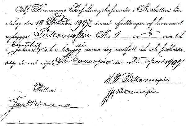 Ur avvittringshandlingen............ må tilldelas tilldelas Siikavuopio Nr. 1 för 1/8 mantal 220 hektar, hvaraf, då 1/4 eller 55 hektar afsättes till bildande af en häradsallmänning för Karesuando socken, 3/4 eller 165 skall utgöra enskilda områden. I fråga om skiftesläggningen anser jag, att, då duglig skog ej finnes att tillgå närmare än 8 a´9 mil nedåt landet, hemmanets ägor kunna efter verkställdt ägoutbyte med Naimakka hemman, läggas i två skiften ...................