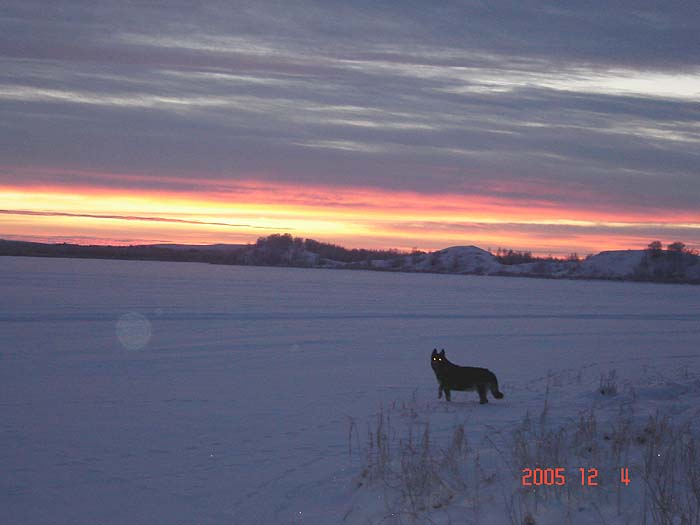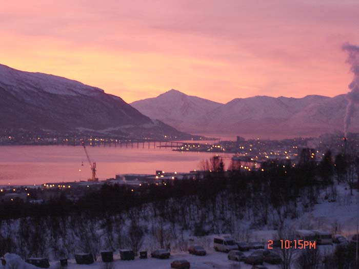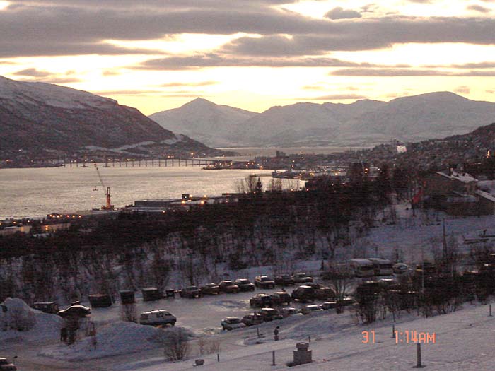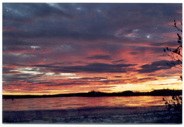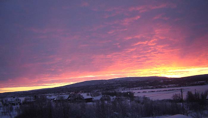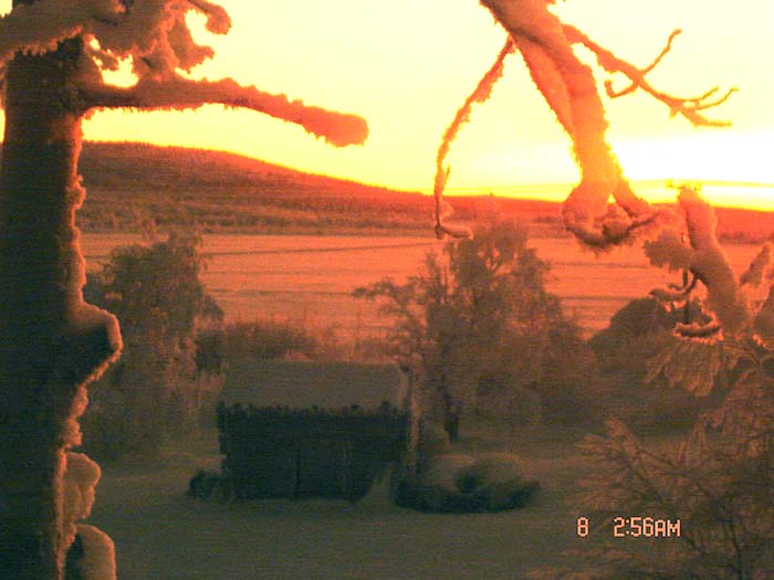 Bilden är tagen i början av december 2003 kl. 13.30. Solen når ej mera upp över horisonten och motivet är sjön Kaarevuopio med Tievat eller "kullarna" i bakgrunden. Lägg märke till den onormalt lilla snö mängden för årstiden.