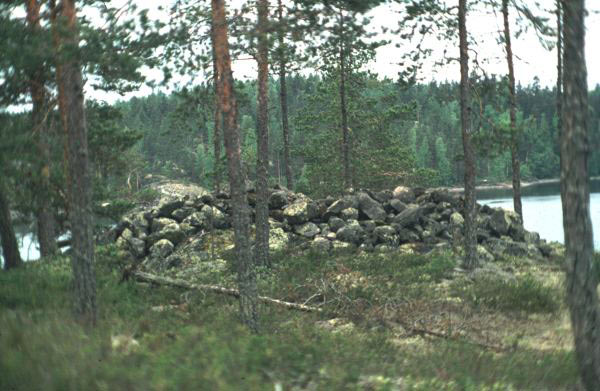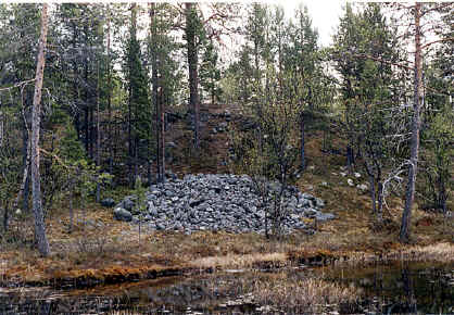 Bilden är tagen i skogen mellan Karesuando och Mertajärvi på våren 2003 och visar en hög med runda stenar vid en tjärn. Högen verkar vara gjort av människas hand.