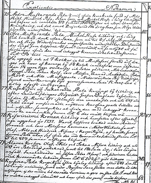 ........................Och då varje jordägare, enligt 12 Cap. 4 § Jorda Balken och Kongl. stadga om fiskerierna i riket den 14 November 1766, ägde vatten och fiske efter sin bolstad och rågång, tillika med saltsjö fisket inomskärs då de ägde strand och holmar däromkring, ävensom vid öppna havsstranden och utom skären så långt dess landgrund räckte, samt vid stranden lågo och därifrån utlöpte, måste anses hava åtföljt de överlåtna hemmanen, ibland vilkas härligheter den jämväl påtagligen varit skattens och andra tyngders bestämmande avsedd och påräknad, helst Kongl. Maj:ts den 19 December 1695 i avseende å då förehavd rotering till knäkthåll för Westerbottens regemente till Roterings Commission avlåtne nådiga skrivelse, omförmälde bland annat, hurusom varje bys förmåner till lax-, havs- och notfiske blivit i beräkning tagna, samt den för Westerbotten den 23 Augusti 1773 utfärdade skatteläggnings metod stadgade, att hemman för husbehovs fiske, och vilken avgift i jordeboksräntan ingick;