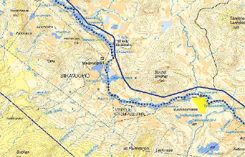 Ur avvittringshandlingen............ må tilldelas tilldelas Siikavuopio Nr. 1 för 1/8 mantal 220 hektar, hvaraf, då 1/4 eller 55 hektar afsättes till bildande af en häradsallmänning för Karesuando socken, 3/4 eller 165 skall utgöra enskilda områden. I fråga om skiftesläggningen anser jag, att, då duglig skog ej finnes att tillgå närmare än 8 a´9 mil nedåt landet, hemmanets ägor kunna efter verkställdt ägoutbyte med Naimakka hemman, läggas i två skiften ...................
