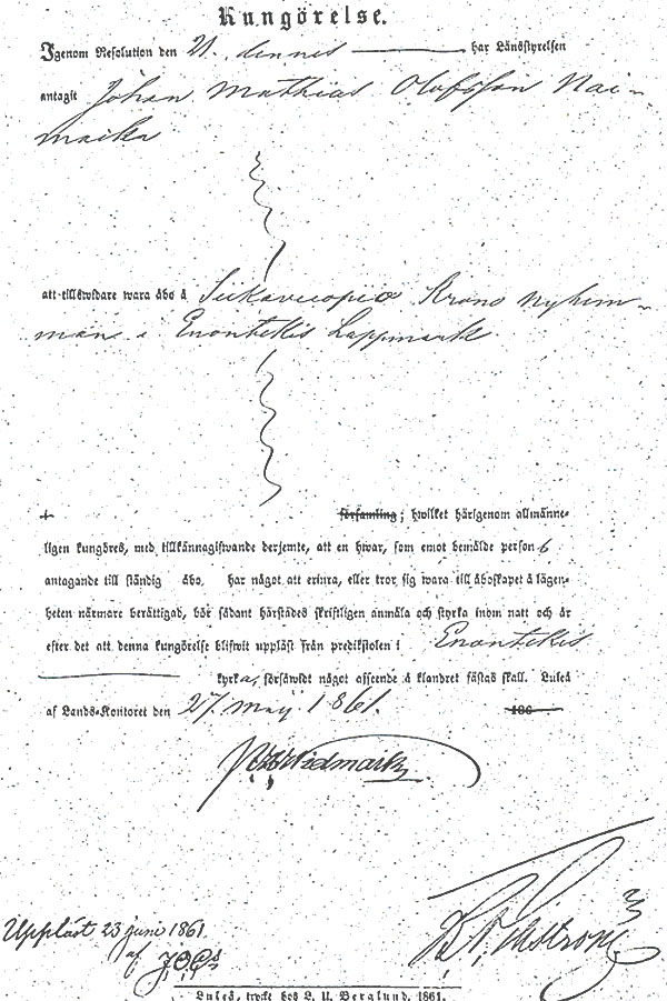 Denna kungörelse från Landskontoret av 26 maj 1861 förkunnar att Johan Mattias Olofsson Naimaka, (stamefternamnet skall vara Riska eller senare Siikavuopio), har fått äganderätt till hemmanet Siikavuopio Nr.1.